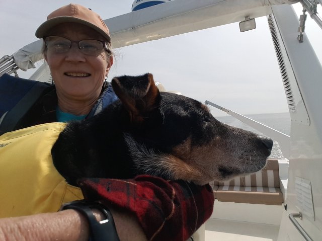 Bailey doesn’t really like it when Arcturos is moving but, he loves riding in the tender, up in the bow nose to the wind, ears flying. We store the tender aft on the fly bridge and have a crane that lifts the tender up, swings it over the water and slowly lowers it into the water. Bailey always likes to help. Any time Pat goes up on the fly bridge, he has a little shadow. At Small Bay, Pat decided to let the dog ride down to the water in the tender. Bailey jumped right in and up he went. Pat swung the tender over the water….well almost over the water. The cable broke, the bow hit the corner of the awning and the tender dropped, engine 1st, vertically into the drink. Bailey hasn’t given us his version of the incident but, when Pat next saw him, he was swimming for shore. As soon as he could stand up, he turned around, and refused to swim anywhere near either the boat or his people. Fortunately, I was down getting my wetsuit on for a swim and ran up with all the commotion, just in time to get to swim after the tender which had, also fortunately, landed intact and upright. Bailey then swam back and forth, to boat, to shore and back a couple times before he finally agreed to climb up my legs to get back on Arcturos and, we think, forgive us.
