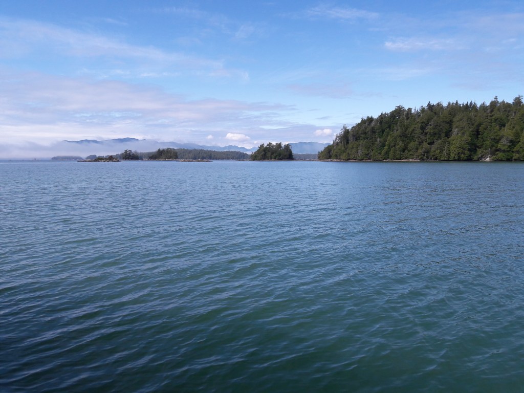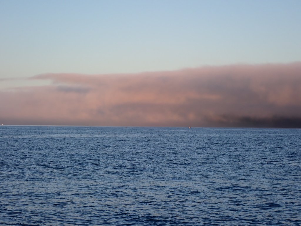 A slip of fog in the Port San Juan (Renfrew) led us to a thick fogbank that enveloped and accompanied us all day. Glad for radar but tired as we monitored it along with the charts and the disorienting, hallucinatory fog. Swells grew to 4-6 feet, 6-7 seconds apart, uncomfortable but the wind, thankfully, died to 2 or less knots.