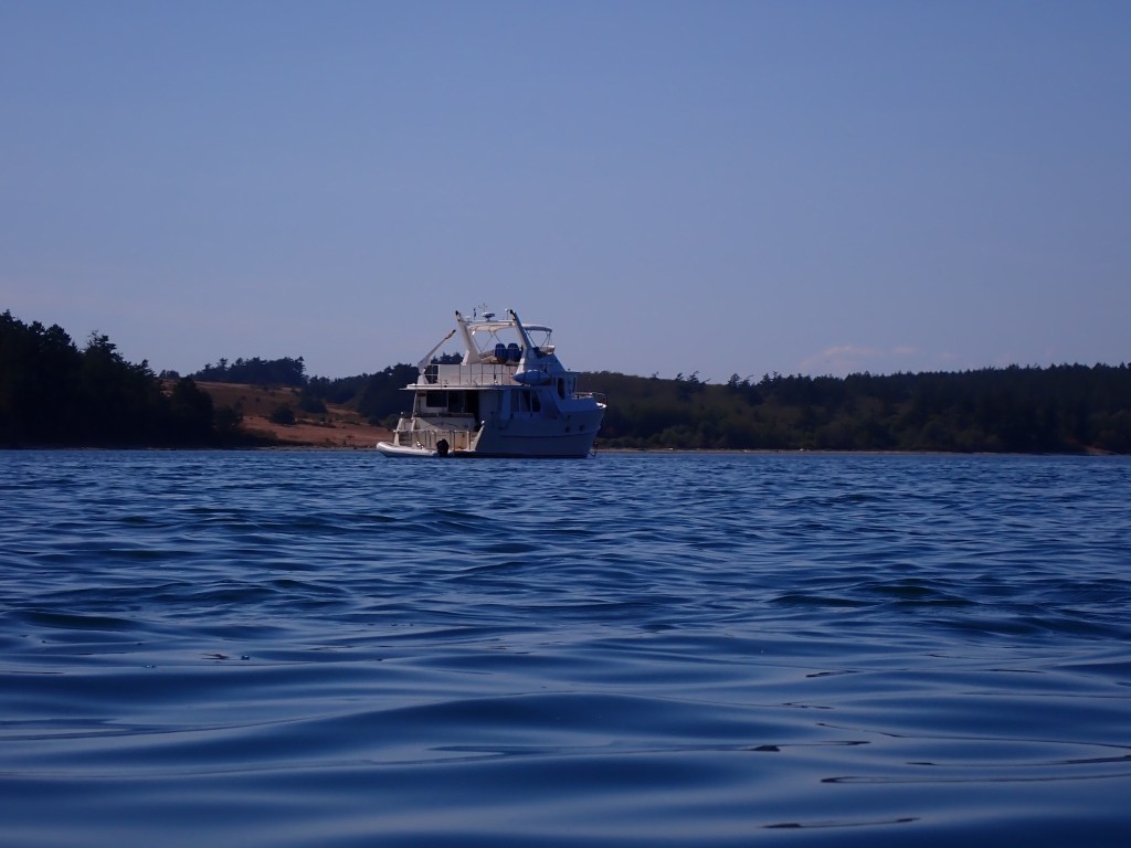 It was a beautiful morning. Seas were calm. Sucia Island was in view, an hour away. I took over driving Arcturos as Pat went down for a routine engine check. It’s never good news to see a cupful of oil coating the floor below an engine. The hydraulics of the Starboard engine had sprung a leak. Pat checked the breather tube (whatever that is) which wasn’t clogged. That would have been the only easy fix.
