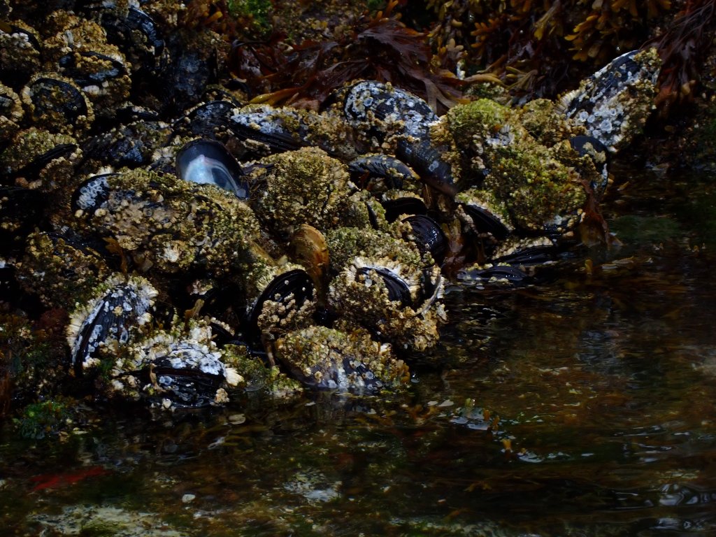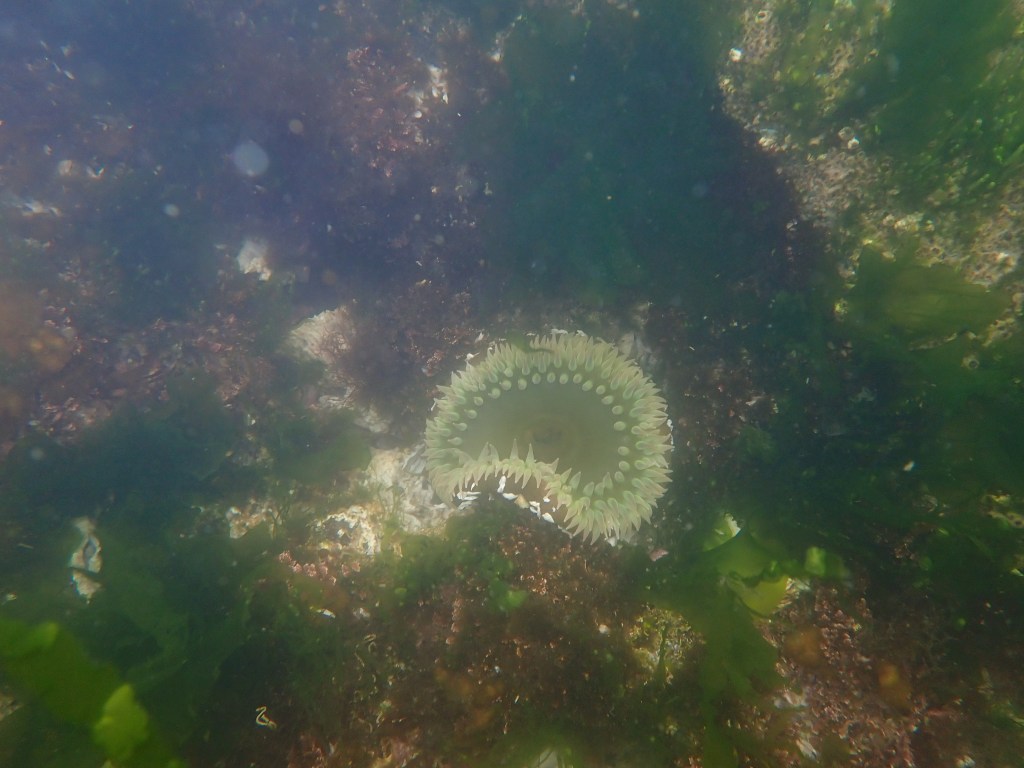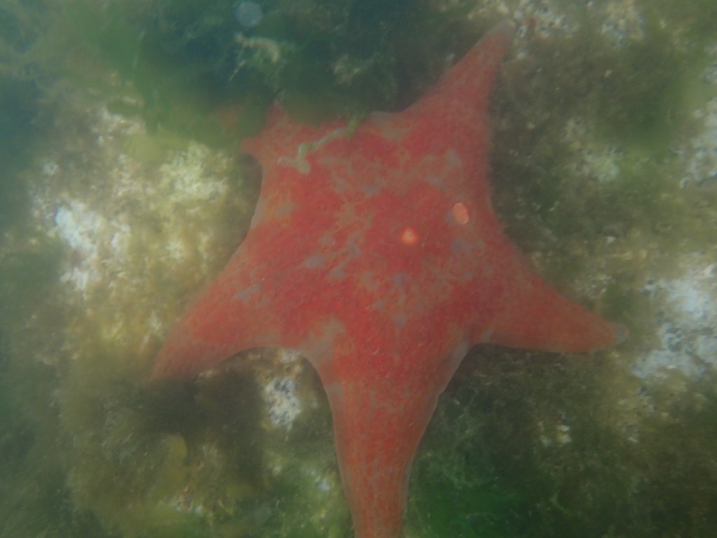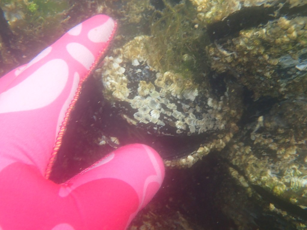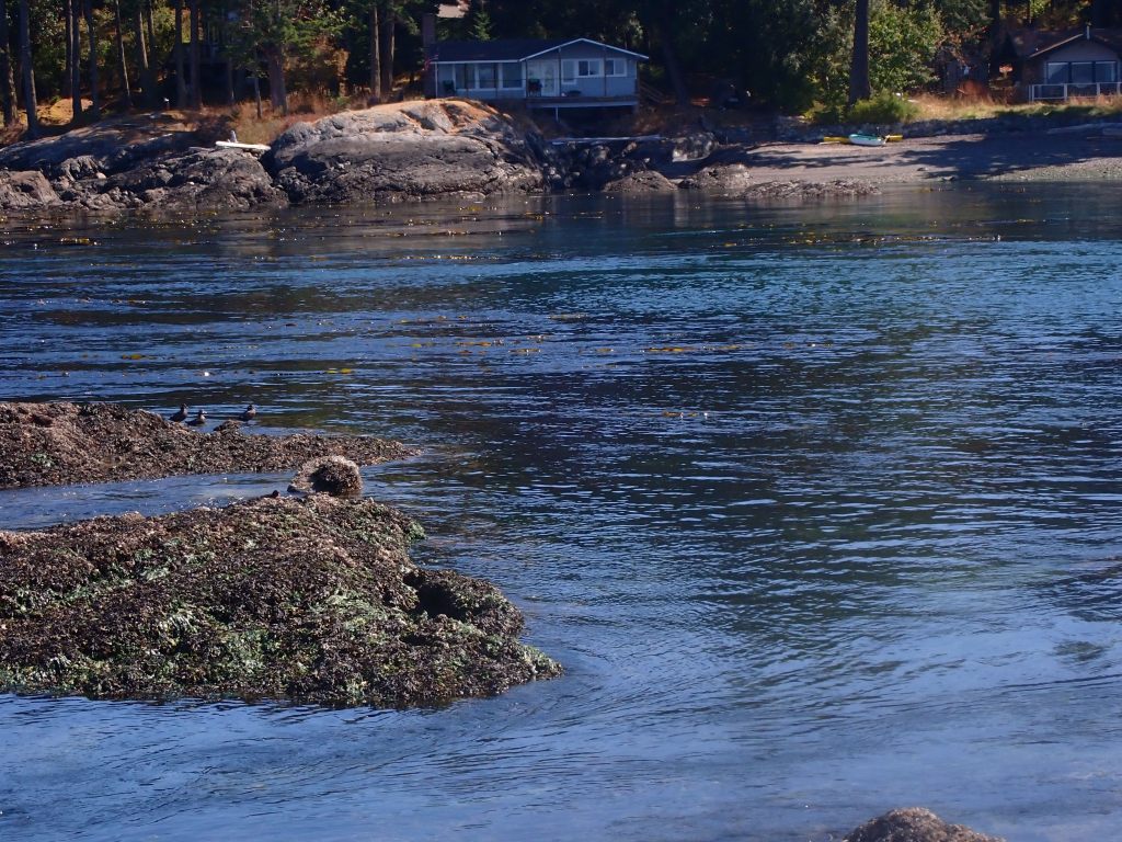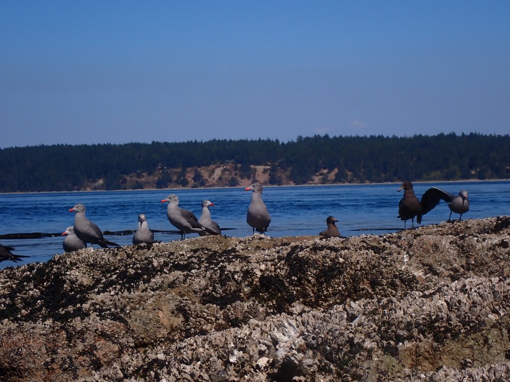 I was thrilled seeing long flowing seaweed beneath me, almost there, when something bumped me in the leg. Suddenly I was swimming for my life as the ebbing current flowing around the island grabbed me, dragging me towards the North side of the island to who knows where! Fortunately, it was only ?15-20 yards cross current to get to the island where an eddy around the north side invited me in, puffing away. The barnacles were not so inviting but it was fun exploring this rock, Sea Stars beneathe, startled birds above, Oyster catchers after a meal and seals rising a foot out of the water to see what had invaded their island. I could not figure out how to attach videos to this blog or you would see the current and island better.