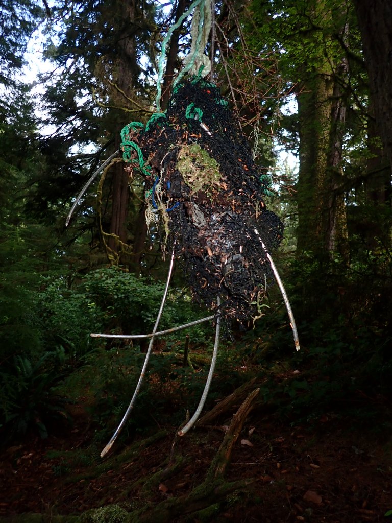 A creation of metal, fish net, rope and who knows what else but it is pointing in the general direction of the trail