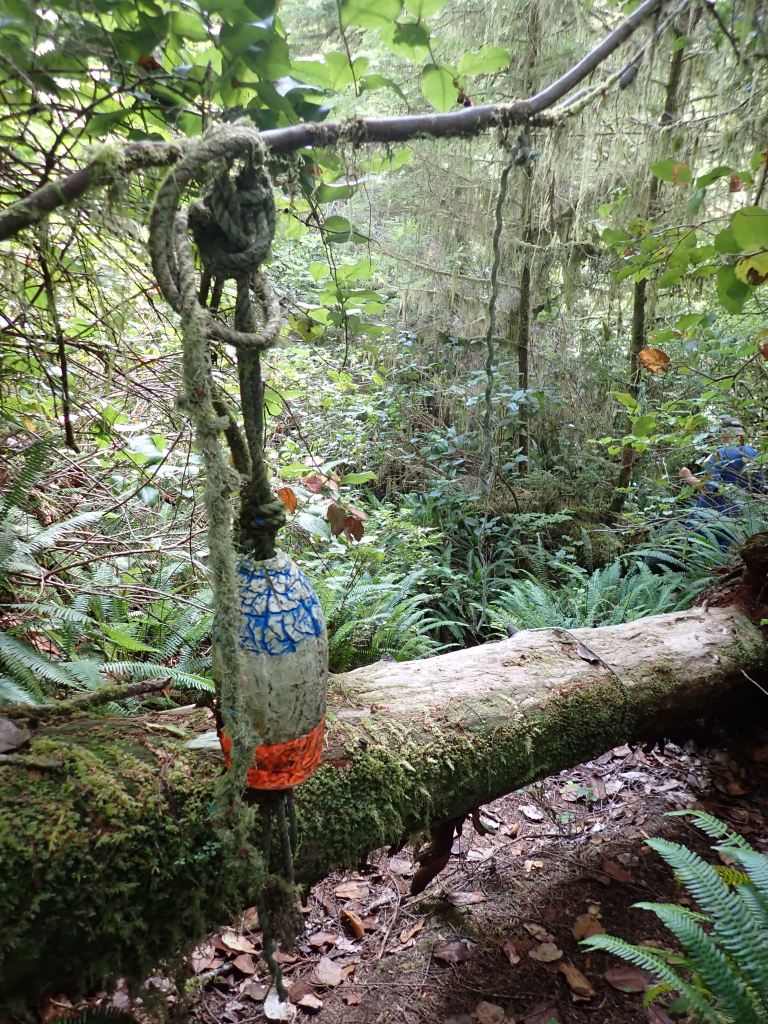 Heading up an open grassy patch into the woods on an apparent trail with cut logs and planks led 15 minutes along a tiny muddy creek, over slippery logs, to a dead end. Back to square 1. The trail is obvious once you see it. It is a typical Canadian National Marine Park trail, almost indistinguishable save for the amusing marine detritus markers.