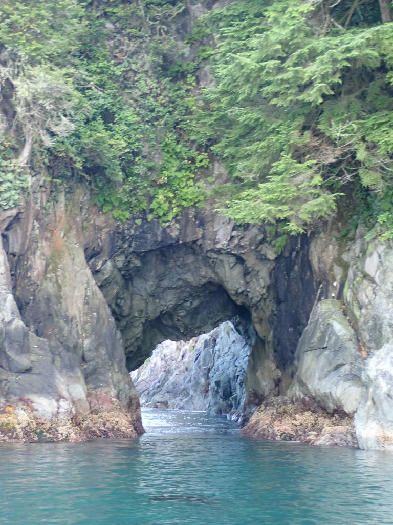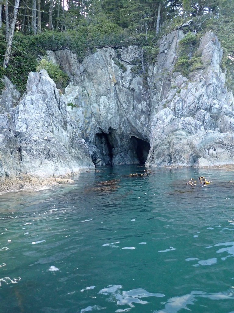 We had read there was a sea cave on this island so took the dinghy for a spin after exploring the trail. We found it just past the midden! and a few other fun formations.